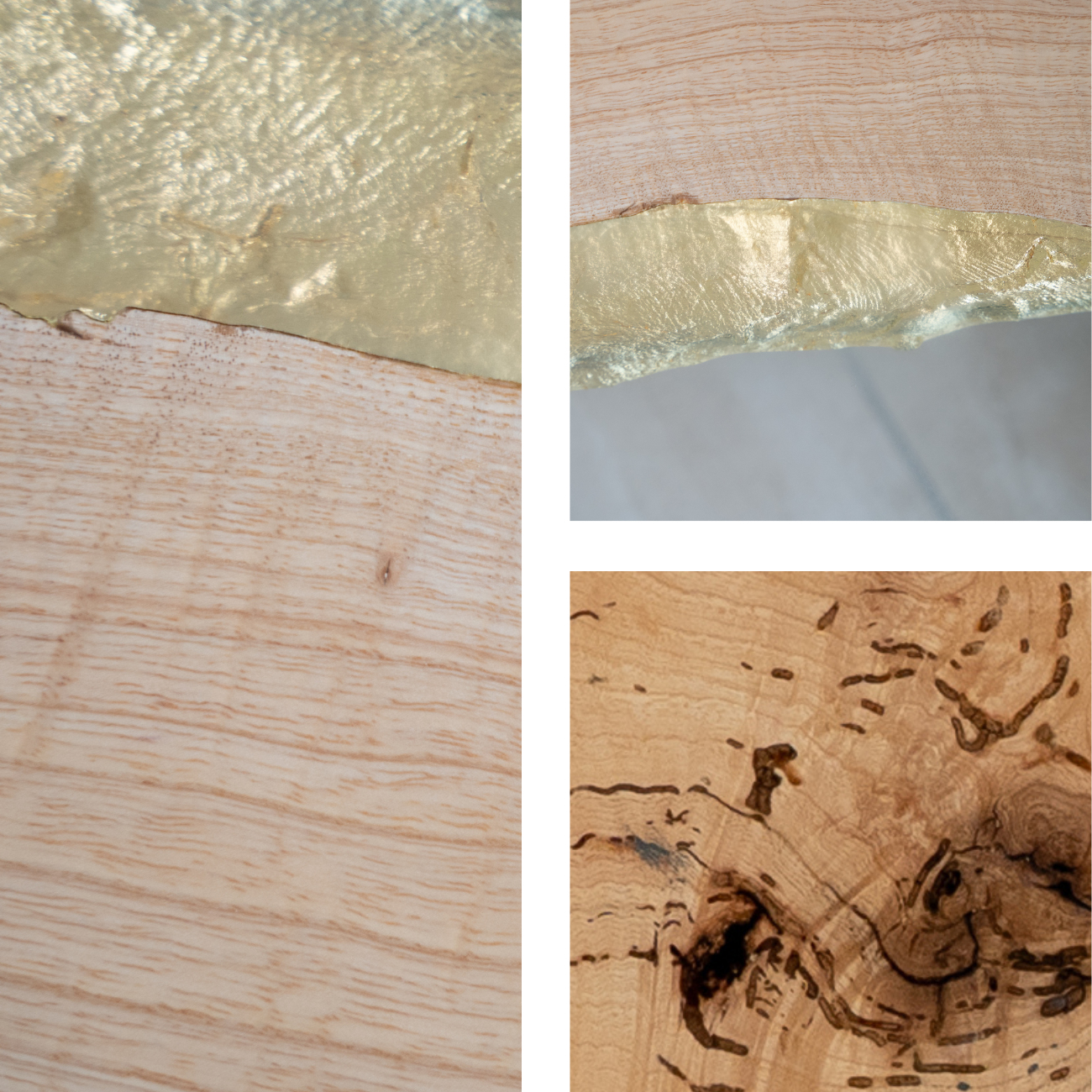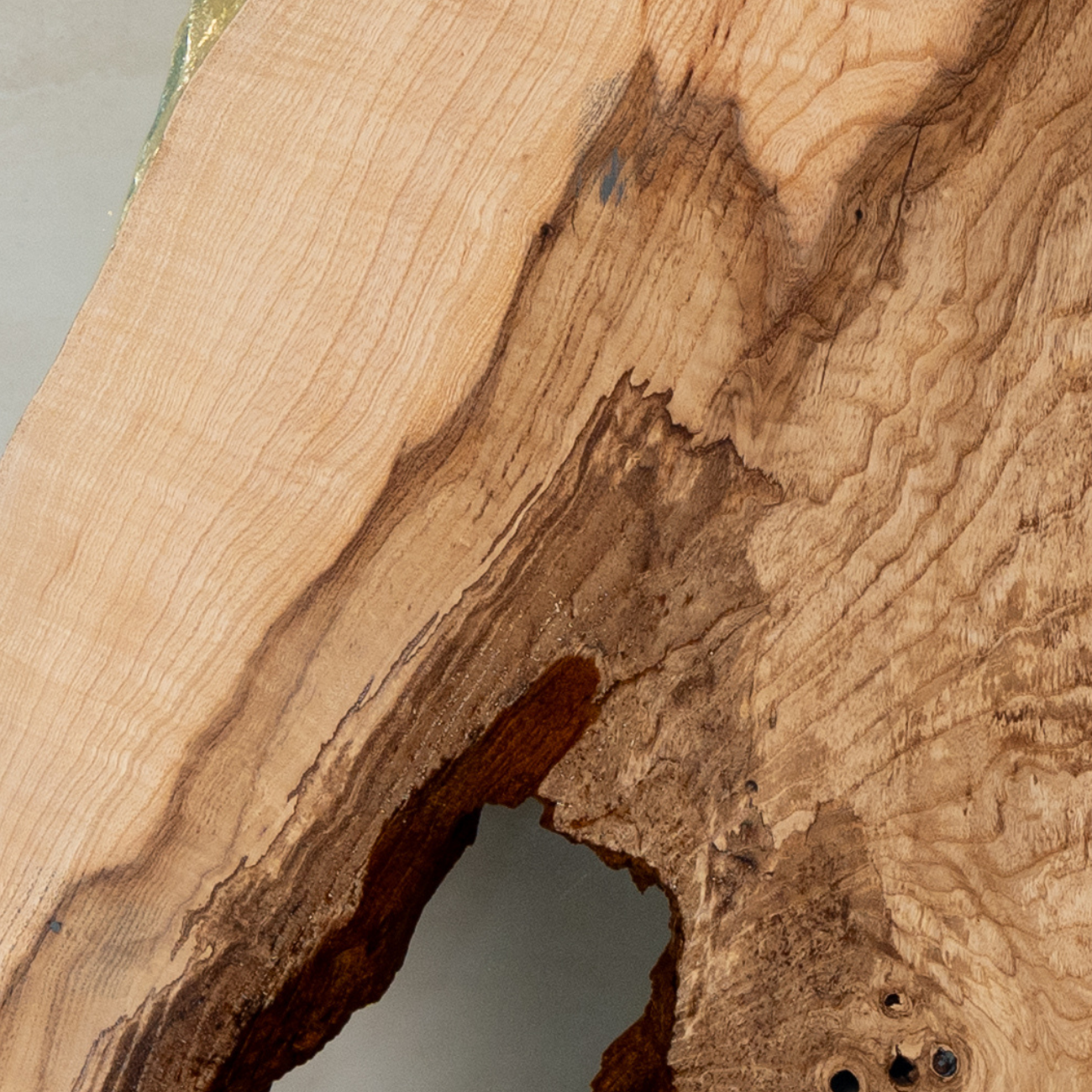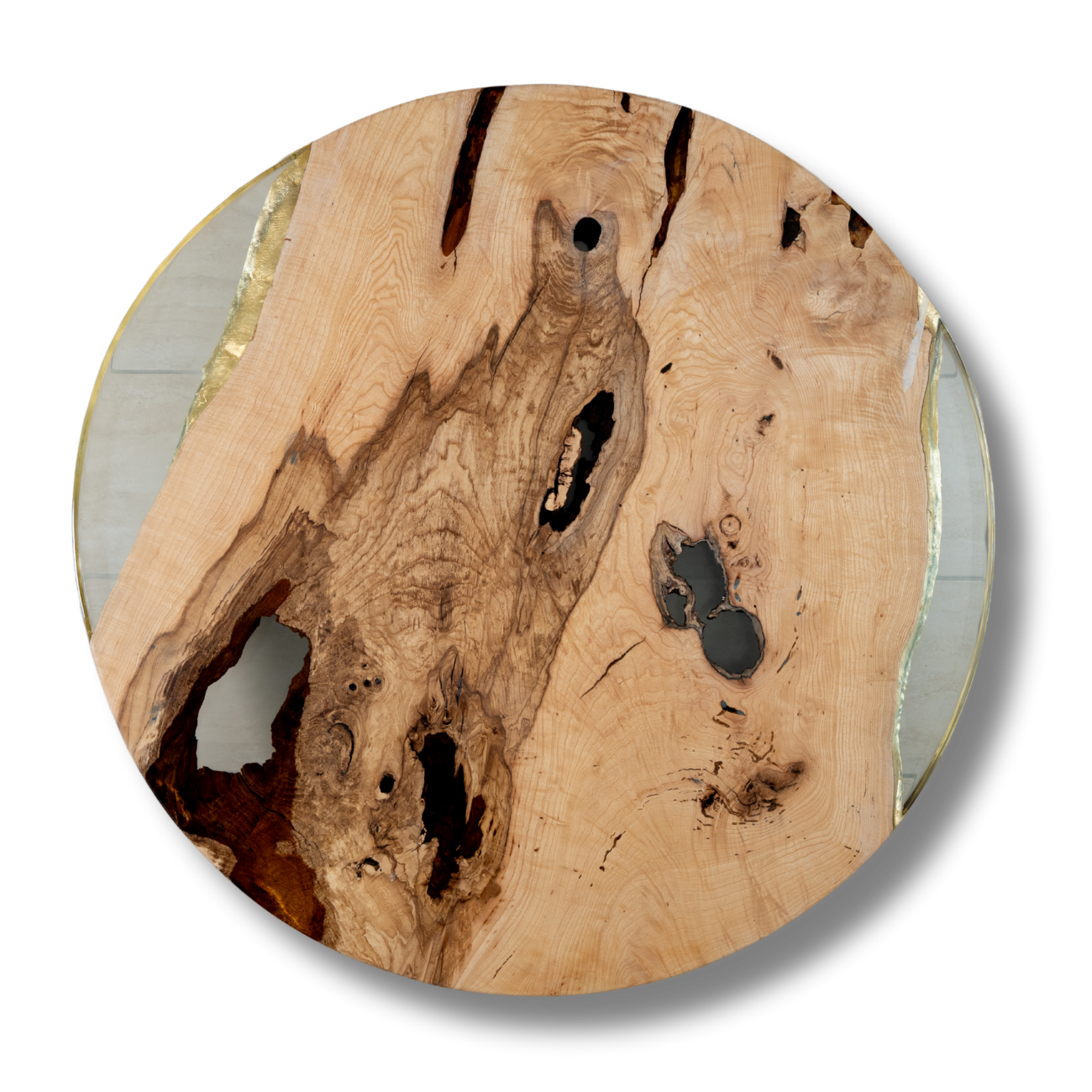 Discover the unique beauty of this oval tabletop made from 250-year-old ash wood. The wood reveals a natural, rustic surface with distinctive cracks, natural cavities, and captivating color variations ranging from light beige to deep browns and almost black accents. Its striking grain tells the story of a tree that has grown for over two centuries. Elegant golden or metallic inlays along the edges add a modern contrast, perfectly highlighting the natural aesthetics. The unpolished or deliberately rustic finish emphasizes the authentic character of this extraordinary natural material. Ideal for lovers of artisanal craftsmanship and sustainable design – a timeless piece of furniture that unites history and modernity.