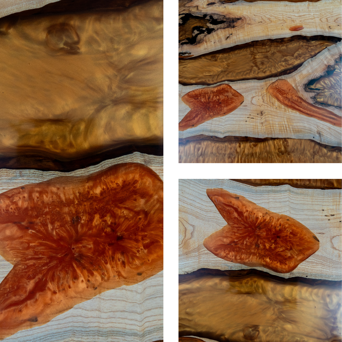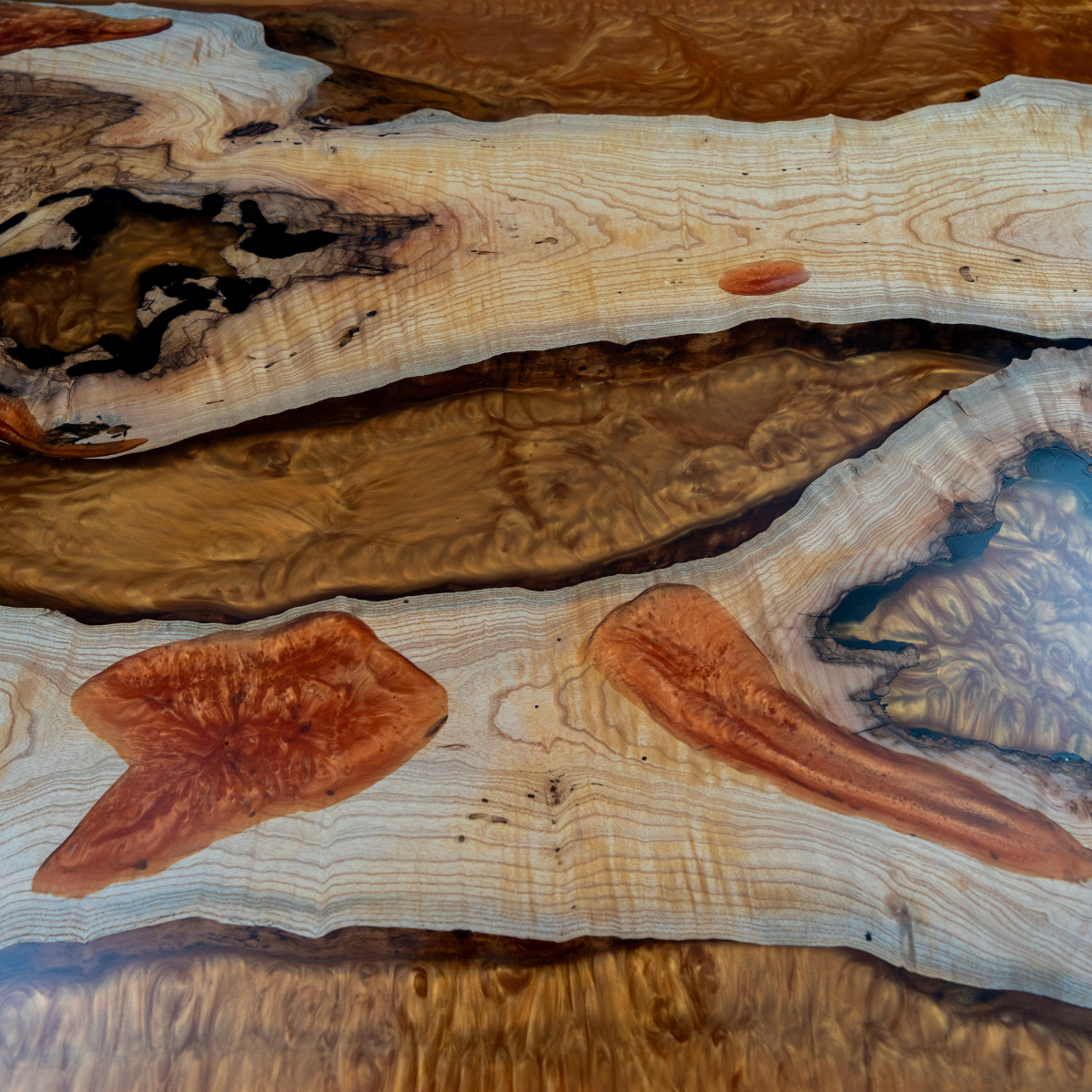 Experience the majestic presence of this handcrafted table made from 450-year-old ash wood, refined with an artful epoxy resin inlay in golden and bronze tones. The tabletop showcases an impressive natural grain with distinctive knots and cracks that harmonize with the glossy resin, flowing like a river of liquid gold through the warm, light brown wood. This unique combination of rustic character and luxurious design makes the piece a true work of art. With a length of 191.5 cm, it is ideal as an office desk or dining table, perfect for sophisticated work or dining spaces. The smooth, polished surface offers a pleasant feel and easy maintenance, while the exceptional aging of the wood and high-quality craftsmanship ensure unparalleled durability and stability. An incomparable piece of furniture for lovers of sustainable craftsmanship and exclusive style!