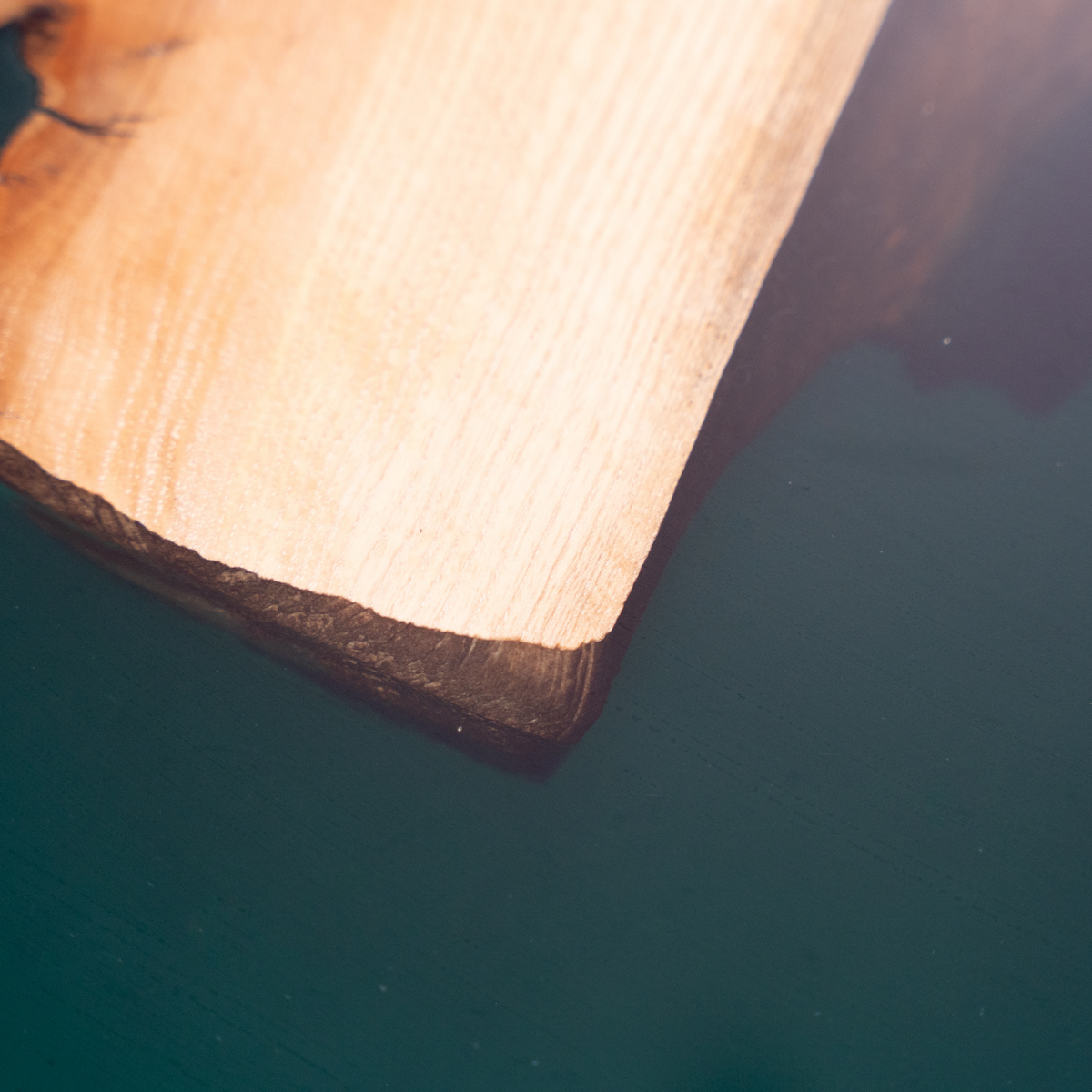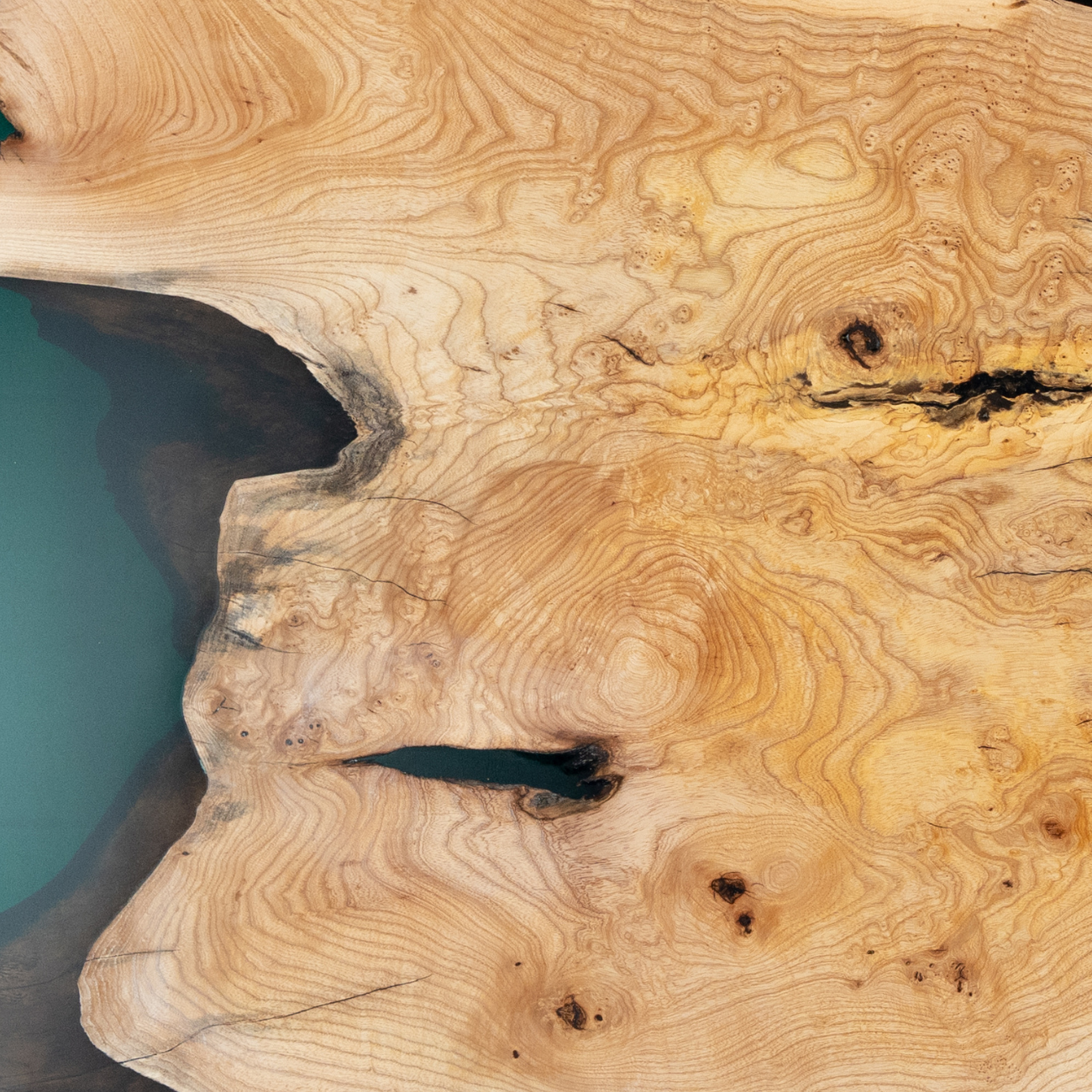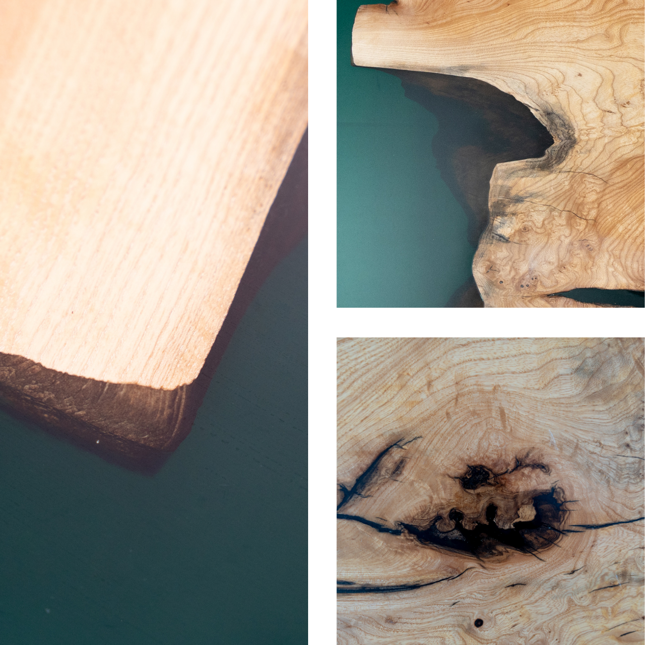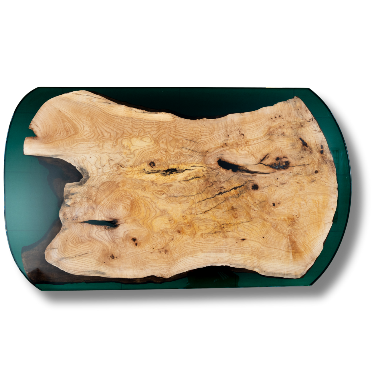 Dieser handgefertigte Tisch, gefertigt aus 190 Jahre altem Holz, das eine reiche Geschichte und einzigartige Maserung aufweist. Die Tischplatte besticht durch ihre natürliche Struktur mit markanten Knoten und Rissen, die in einer tiefgrünen Epoxy-Harz-Einlage eingebettet sind, die den Look eines stillen Teichs im Wald erzeugt. Die glatte Glasunterlage hebt die organische Form des Holzes hervor und verleiht dem Stück eine moderne, luftige Ästhetik. Mit Maßen von 171 cm Länge, 100 cm Breite und 4,5 cm Höhe bietet dieser Tisch eine großzügige Fläche, die perfekt in zeitgenössische Wohnräume oder stilvolle Arbeitsbereiche passt. Die hochwertige Verarbeitung und die nachhaltige Materialwahl machen ihn zu einem langlebigen und außergewöhnlichen Designobjekt. Ideal für alle, die natürliche Handwerkskunst und modernes Design schätzen!