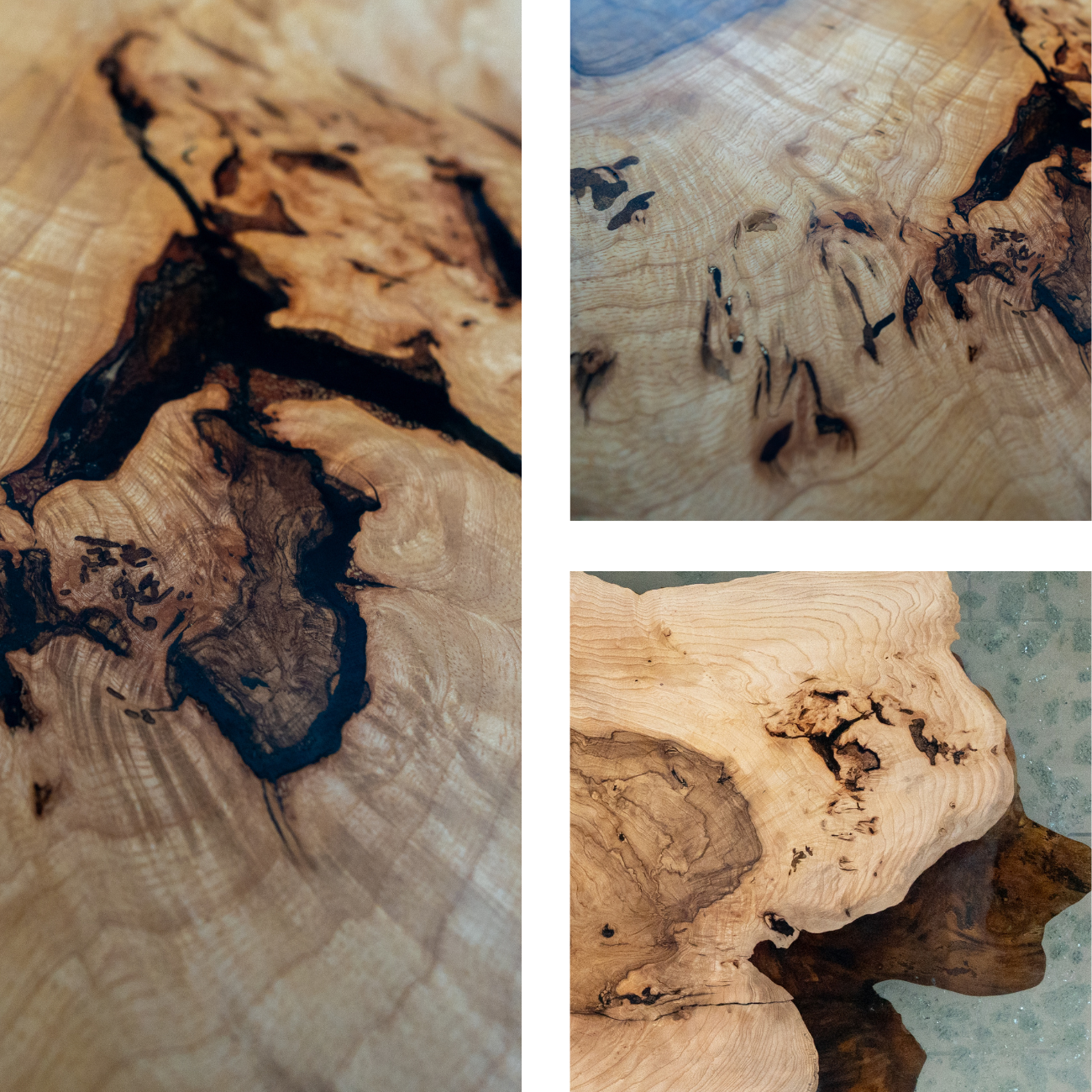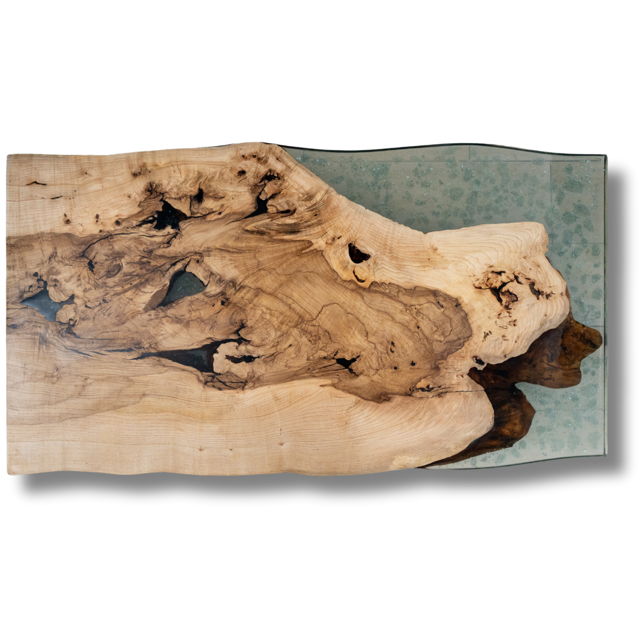 Dieser einzigartige Tisch kombiniert massives Naturholz mit einer transparenten Glasplatte, die die natürliche Maserung und die organischen Formen des Holzes perfekt zur Geltung bringt. Die dunklen Harzflecken und Öffnungen verleihen dem Design einen künstlerischen Touch. Ideal für moderne Wohn- oder Essbereiche, bietet dieser Tisch eine elegante Stabilität und ein avantgardistisches Aussehen.